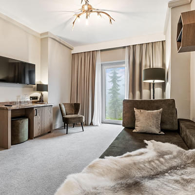 Familien-/Dreibettzimmer Turm 26-30 qm, Dreibett, Turmlage/Talblick, separates Schlafzimmer: kombiniertes Wohn-/Schlafzimmer (durch Tür getrennt), Doppelbett, Sofabett im Wohnraum: ca. 90 x 200 cm, Dusche, Bademantel, Haartrockner, Safe, TV, WLAN |