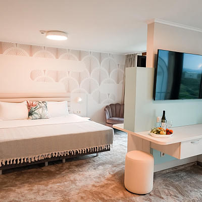 Calimera Zimmer 36-40 qm, Juniorsuite, Hauptgebäude, Nichtraucher, optisch getrennter Wohn-/Schlafbereich, 1 Doppelbett (Kingsize), 1 Sofabett, 1 Bad, Dusche, Badewanne, WC, Haartrockner, Teppich, Klimaanlage, Korridor/Flur, Minibar, Auffüllung regelmäßig, Safe, 1 TV (Kabel-TV, deutschsprachiges Programm, landestypisches Programm, Flachbildschirm), Telefon, Balkon (möbliert), Balkon (möbliert), Bettwäschewechsel, Handtuchwechsel, Spielecke, Summerrack Letzte Renovierung 2023. |