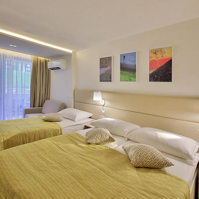 Familienzimmer 16-20 qm, Doppelbettcouch, 1 Bad, Dusche, WC, Haartrockner, Fliesen, Klimaanlage, Korridor/Flur, 1 TV (Kabel-TV, deutschsprachiges Programm, landestypisches Programm, Flachbildschirm), Telefon, Balkon oder Terrasse (möbliert), Bettwäschewechsel, Handtuchwechsel |