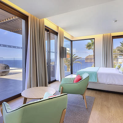 Meerblick-Suiten Meerblick (seitlich), 1 separates Schlafzimmer, 1 Doppelbett (Kingsize), 1 Bad, Dusche, WC, Haartrockner, Kosmetikspiegel, Minibar kostenpflichtig, Safe, 1 TV (Flachbildschirm, Smart-TV), Telefon, Balkon |