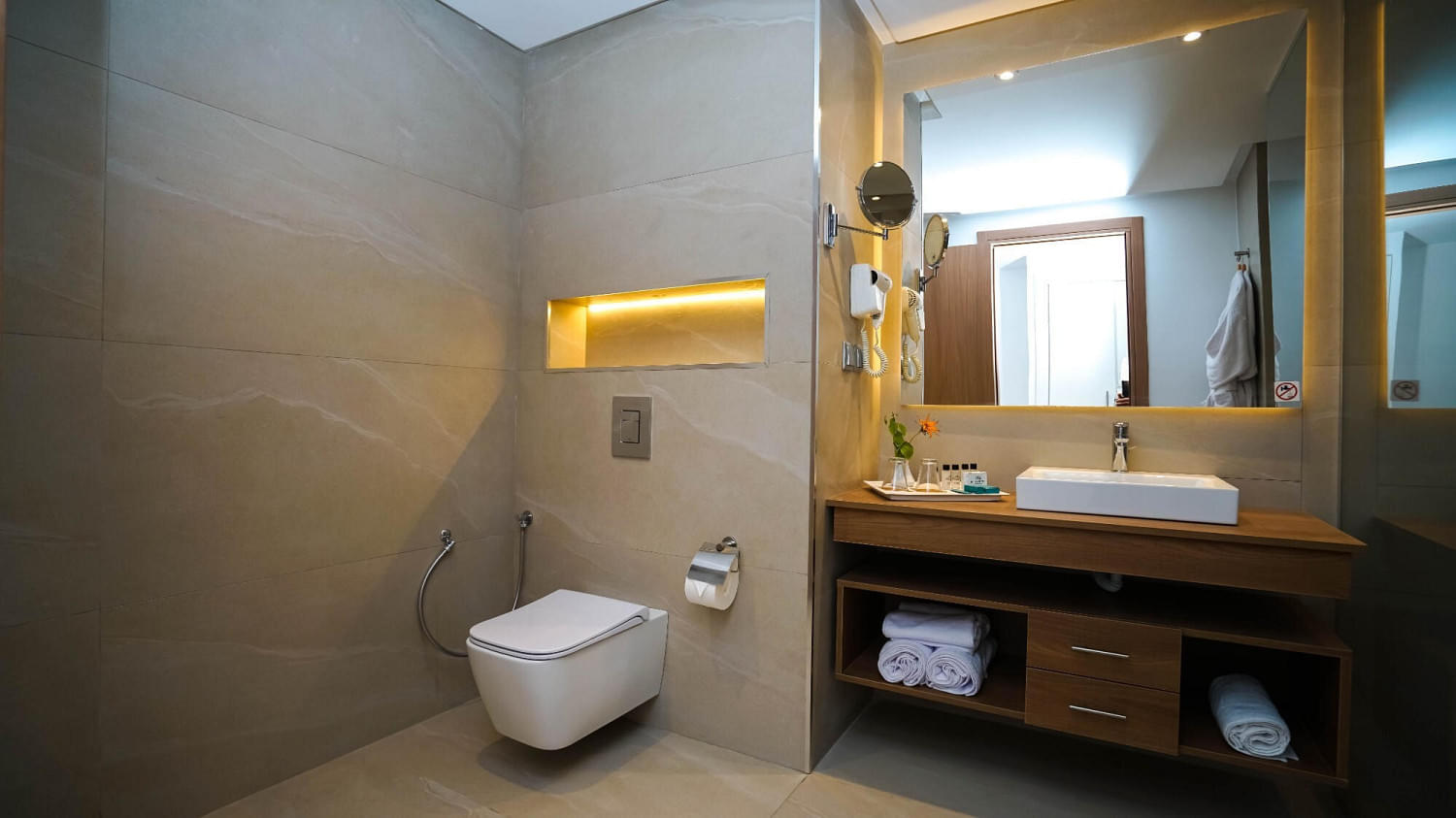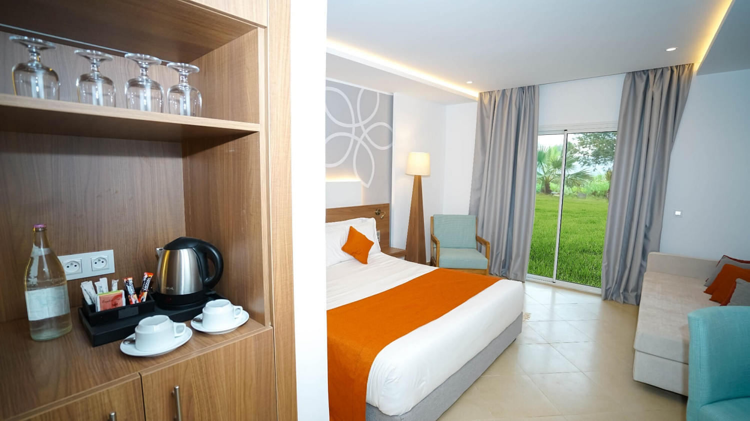 Sentido Room 41-77 sqm, 1 large living room with cozy seating area with 2 sofa beds and 1 separate bedroom with king-size bed, modern furnishings with walk-in closet, seasonal air conditioning/heating (June 15-September 15), 1 bathroom with shower, bathrobes, and slippers, separate toilet, nightly housekeeping, in the main building, pool view, 100% organic cotton bedding, towels, and mattresses, towel change (daily), room service for an extra charge and wake-up service, free Wi-Fi, tea or coffee making facilities (Nespresso machine), magnifying mirror and hairdryer, safe, 2 LCD TVs with international channels, mini fridge (refilled once per person on the day of arrival), balcony with stunning pool view. (Smoking and vaping prohibited) |