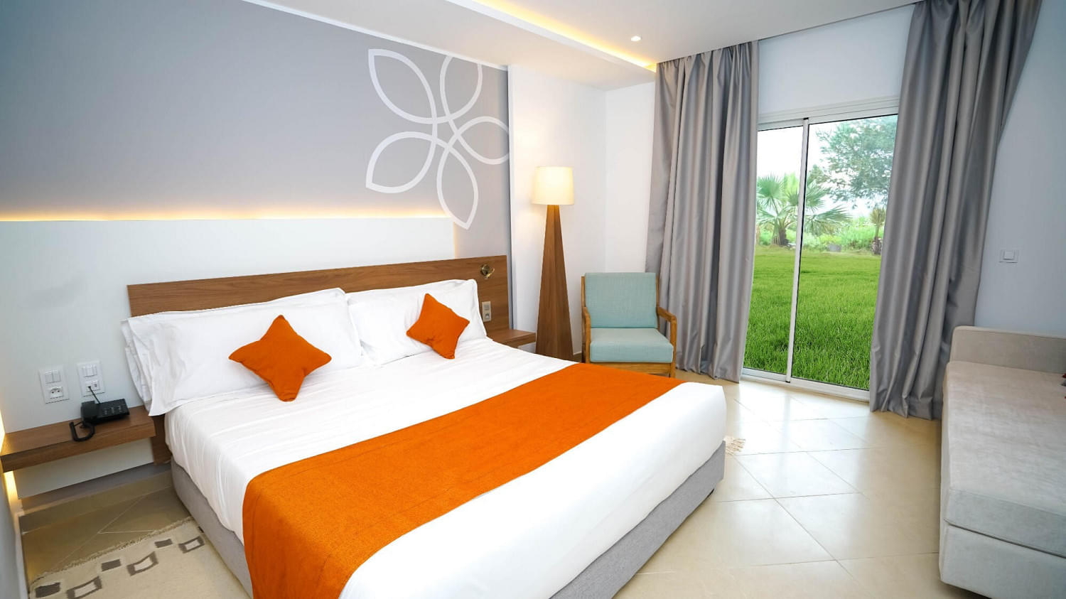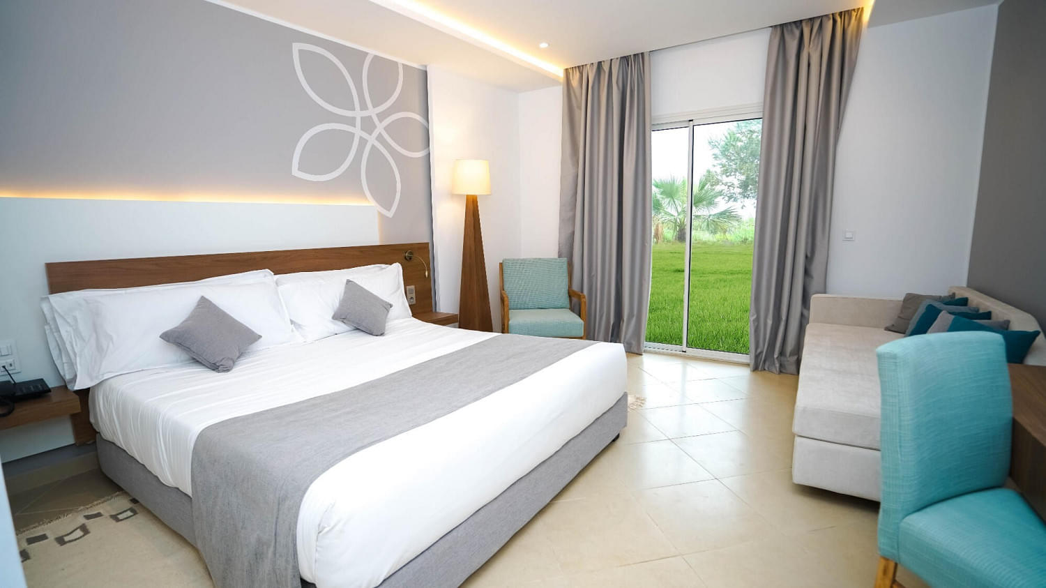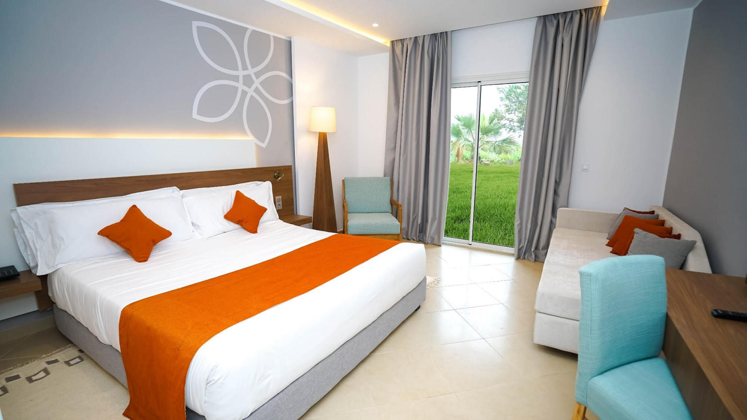Superior Room 26-30 sqm, double, with extra bed, superior, main building, garden view, pool view, renovated (2023), bed linen, towels, and mattresses made from 100% organic cotton, combined living room/bedroom, single bed (king size), twin bed, double bed, sofa bed, 1 bathroom, daylight bathroom, bathtub, separate toilet, air conditioning, approx. June 1–October 31, heating, fan, safe, 1 TV (satellite TV, German-language channels, local channels, other channels), refrigerator, balcony or terrace, bed linen change (3 times a week), towel change (daily) |