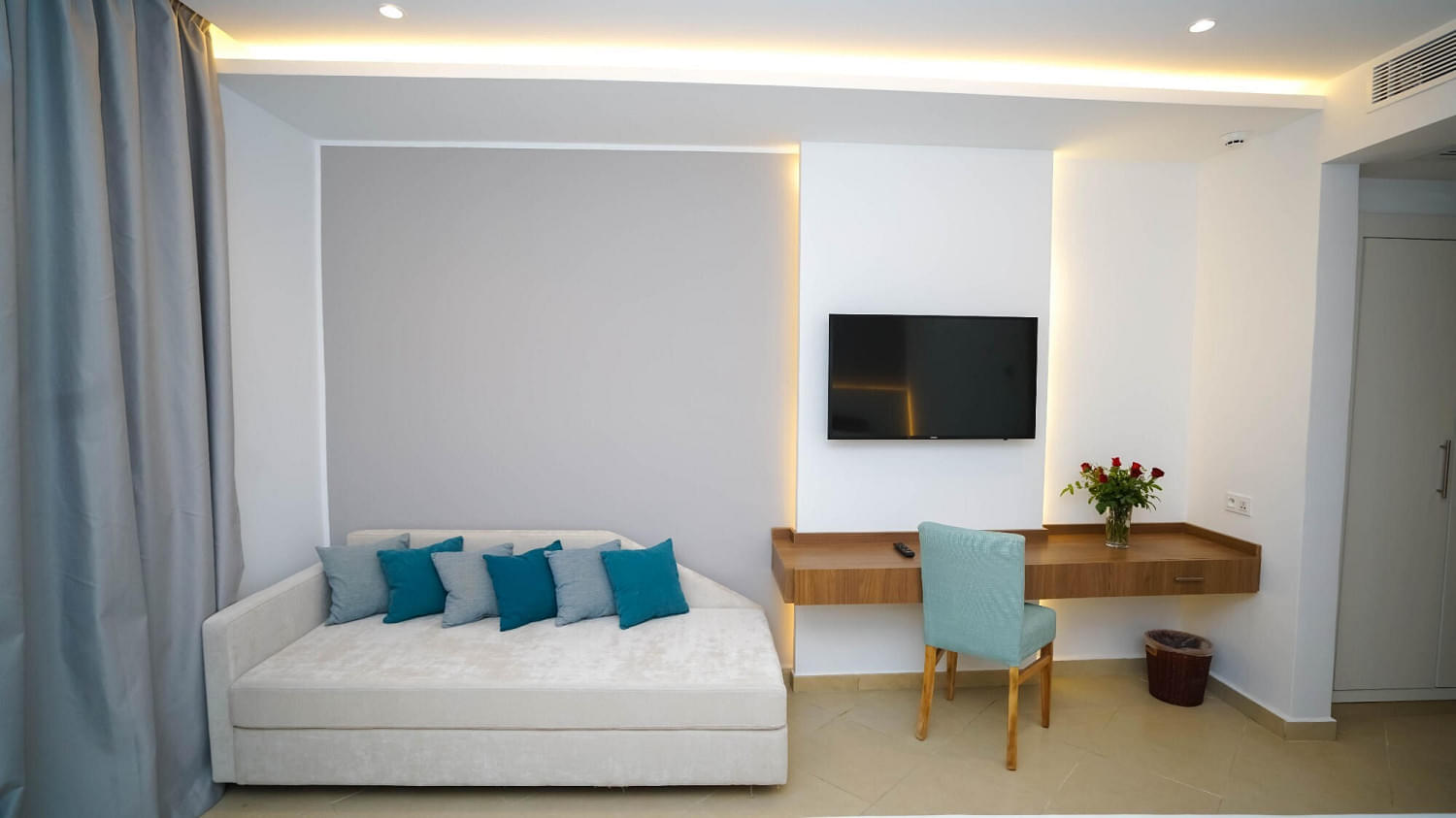 Double Room seaview 31-35 sqm, 1 bedroom with 1 double bed or 2 single beds and 1 sofa bed, seasonal air conditioning/heating (June 15-September 15), night shift housekeeping, in the main building, sea view, bed linen, towels, and mattresses made from 100% organic cotton, towel change (daily), bathroom with shower and toilet, free Wi-Fi, coffee/tea maker, magnifying mirror and hairdryer, room safe, LCD TV with international channels, mini fridge (refilled once per person on the day of arrival), room service for an additional charge and wake-up service, balcony or terrace. (Smoking and vaping prohibited) |
