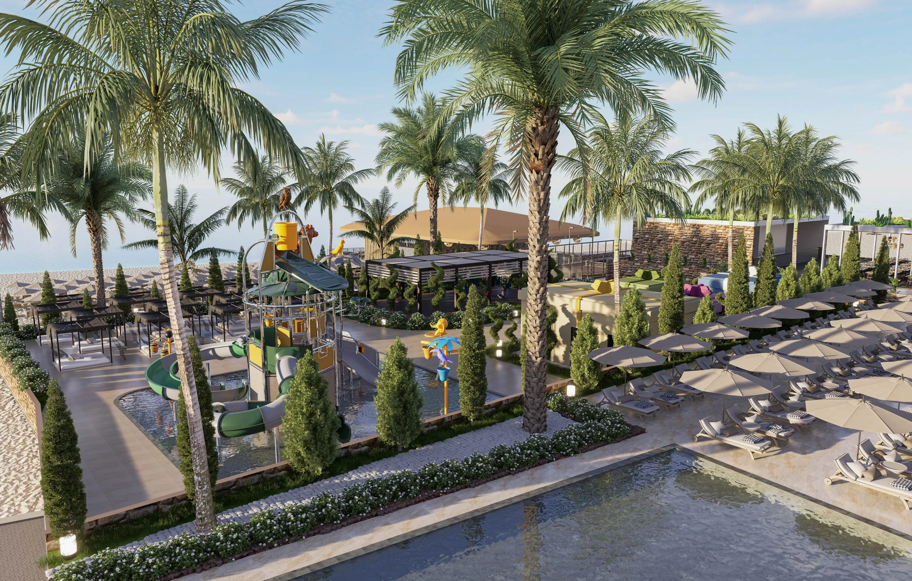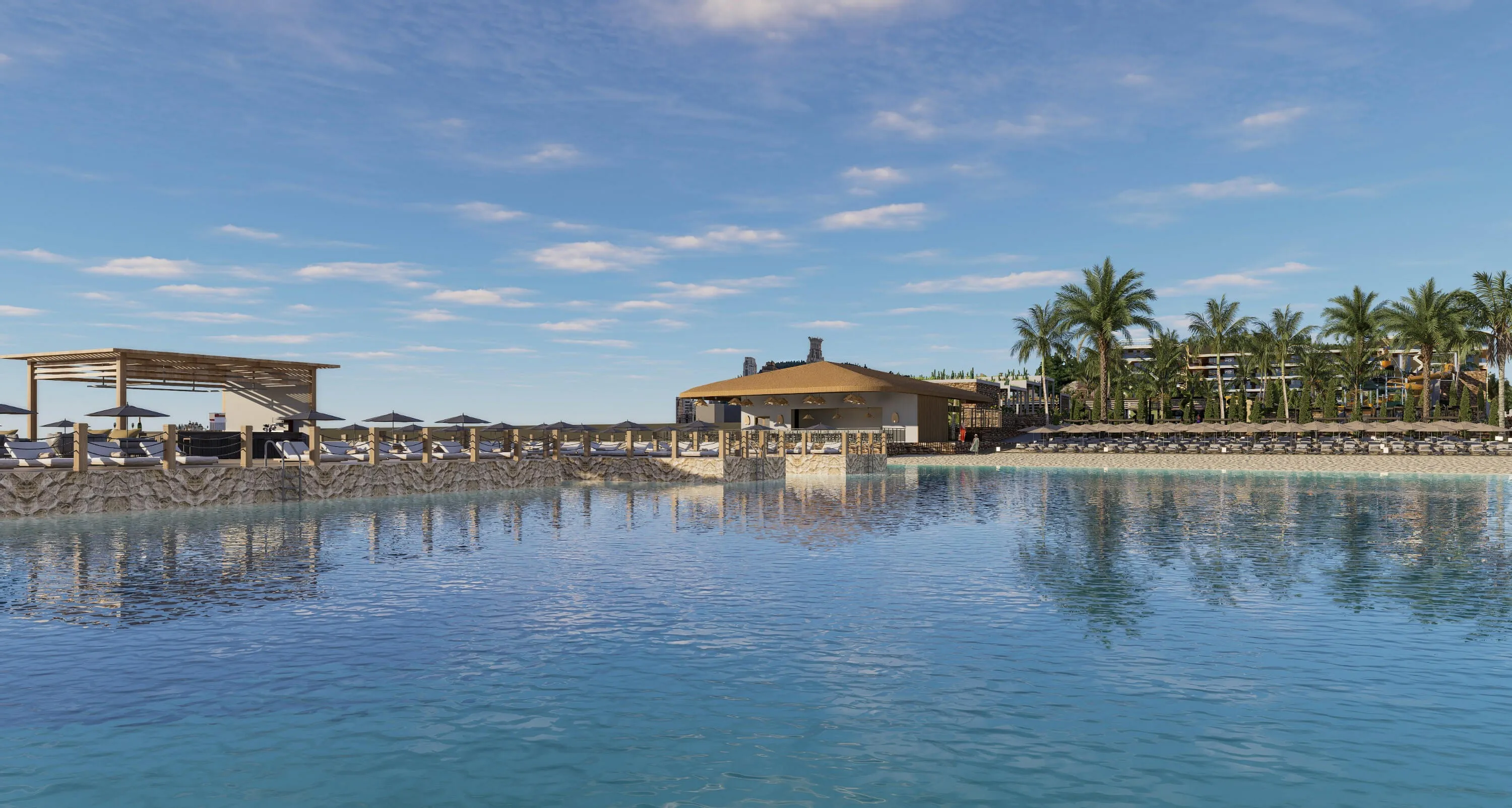 - Weitläufiger, leicht abfallender Sandstrand mit hoteleigener Strandbar