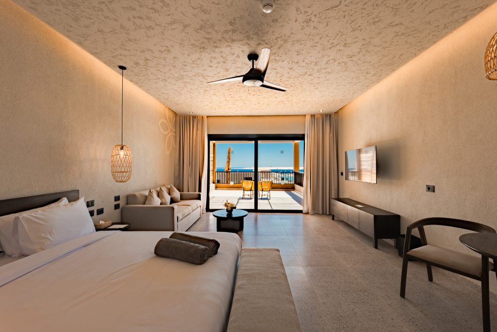 ca. 44 – 56 qm, Junior Suite mit Meerblick, teilweise mit zusätzlichem Poolblick, Klimaanlage, mit Kingsize Doppelbett oder Twin Betten, Sofa, Bad mit Dusche, WC, Haartrockner, Kosmetikspiegel, Minibar (kostenpflichtig), Safe (kostenfrei), TV, Telefon, WLAN (kostenfrei), Kaffee/Tee, Balkon oder Terrasse