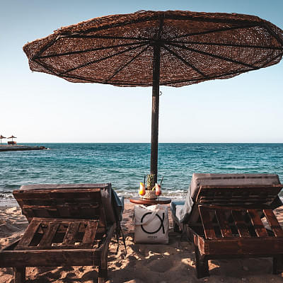- Sandstrand: Sonnenschirme, Liegen, Strandtuch/Badetuch