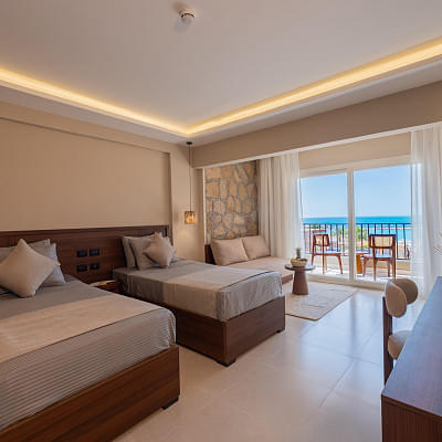 Junior Suite sea view mit Jacuzzi 36-40 qm, Juniorsuite, Nebengebäude, Meerblick (zum Teil seitlich), Doppelbetten (1 Kingsize oder 1 Twin), Dusche oder Badewanne, Haartrockner, Klimaanlage, individuell regulierbar, Minibar kostenpflichtig, Safe, TV (Sat-TV), WLAN, Kaffee/Tee, Balkon oder Terrasse (möbliert), Jacuzzi (Indoor, für 1 Person), bei Ankunft im Zimmer Wasser |