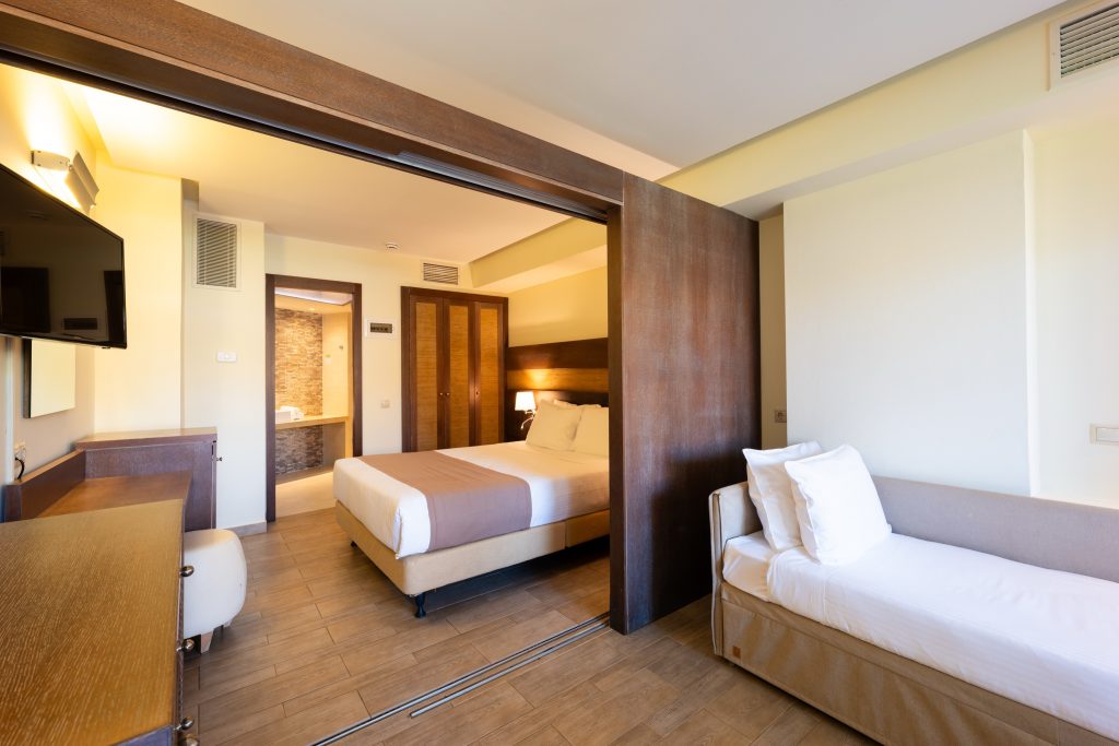 42-50 qm, 2 Doppelzimmer mit Verbindungstür, liegt im Haupthaus, 2 Schlafzimmer, Twinbett, 2 Bäder, Badewanne oder Dusche, WC, Haartrockner, Fliesen, Klimaanlage, ca. 01.06.-30.09., Safe (kostenpflichtig), 1 Kühlschrank, 1 TV (Sat-TV, deutschsprachiges Programm, sonstiges Programm, Flachbildschirm), WLAN, Telefon, Balkon