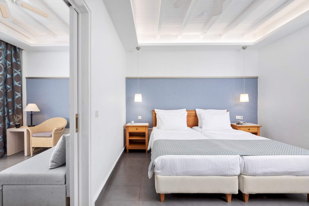 46-50 qm, Familien, Deluxe, Bergblick, Poolblick, renoviert (2024), Bettwäsche, Handtücher und Matratzen aus 100% Bio-Baumwolle, Dusche, bodengleiche Dusche, WC, Bademantel, Badeslipper, Kosmetikspiegel, Klimaanlage, individuell regulierbar, Mini-Kühlschrank, Safe, TV (Sat-TV), Kaffeemaschine, Balkon (möbliert), hochwertige Badartikel