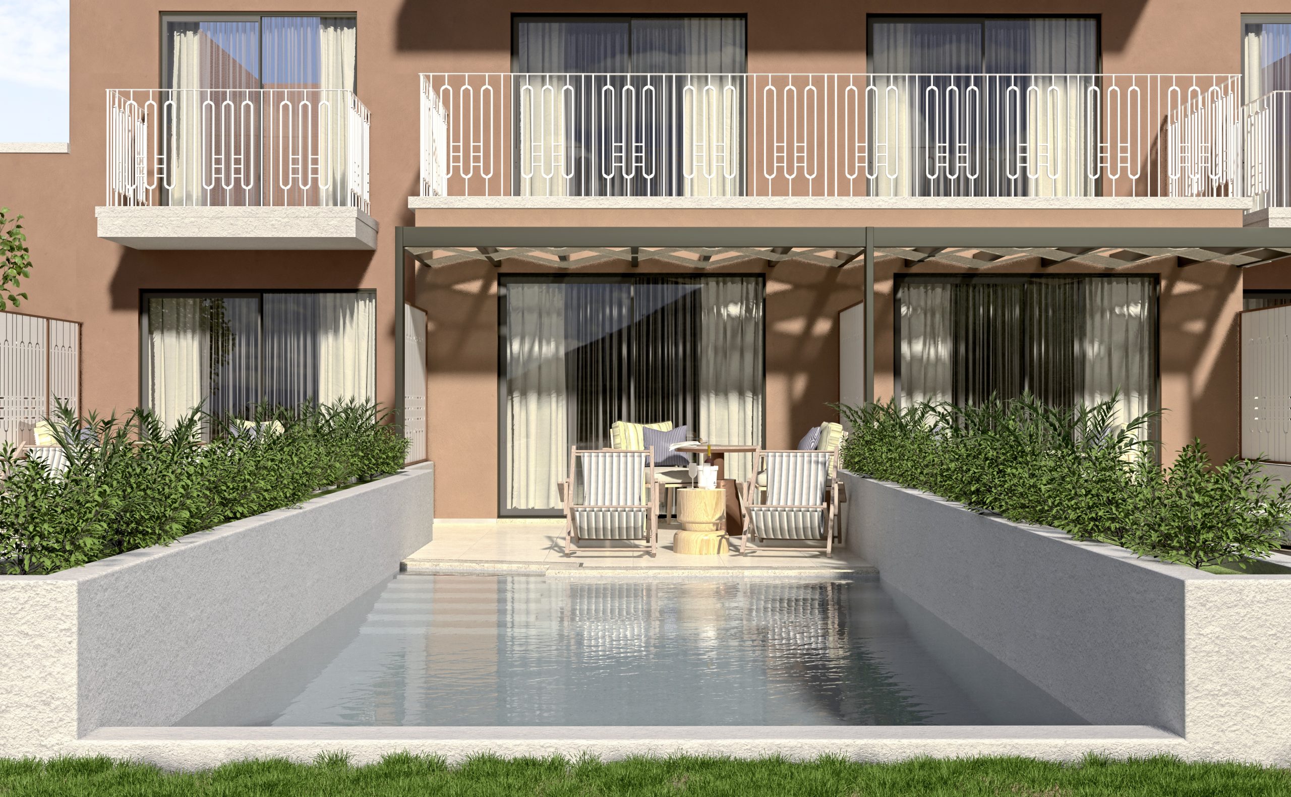 31-35 qm, Familien, Deluxe, Gartenblick, Poolblick, renoviert (2024), Bettwäsche, Handtücher und Matratzen aus 100% Bio-Baumwolle, Dusche, bodengleiche Dusche, WC, Bademantel, Badeslipper, Kosmetikspiegel, Klimaanlage, individuell regulierbar, Mini-Kühlschrank, Safe, TV (Sat-TV), Kaffeemaschine, Balkon oder Terrasse (möbliert), Privatpool, hochwertige Badartikel