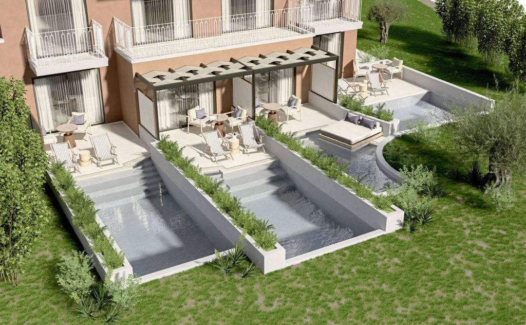 26-30 qm, Doppel, Deluxe, Gartenblick, Poolblick, renoviert (2024), Bettwäsche, Handtücher und Matratzen aus 100% Bio-Baumwolle, Dusche, bodengleiche Dusche, WC, Bademantel, Badeslipper, Kosmetikspiegel, Klimaanlage, individuell regulierbar, Mini-Kühlschrank, Safe, TV (Sat-TV), Kaffeemaschine, Balkon oder Terrasse (möbliert), Privatpool, hochwertige Badartikel