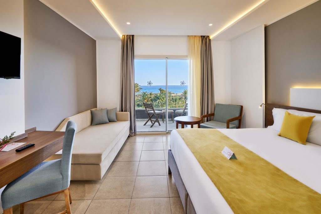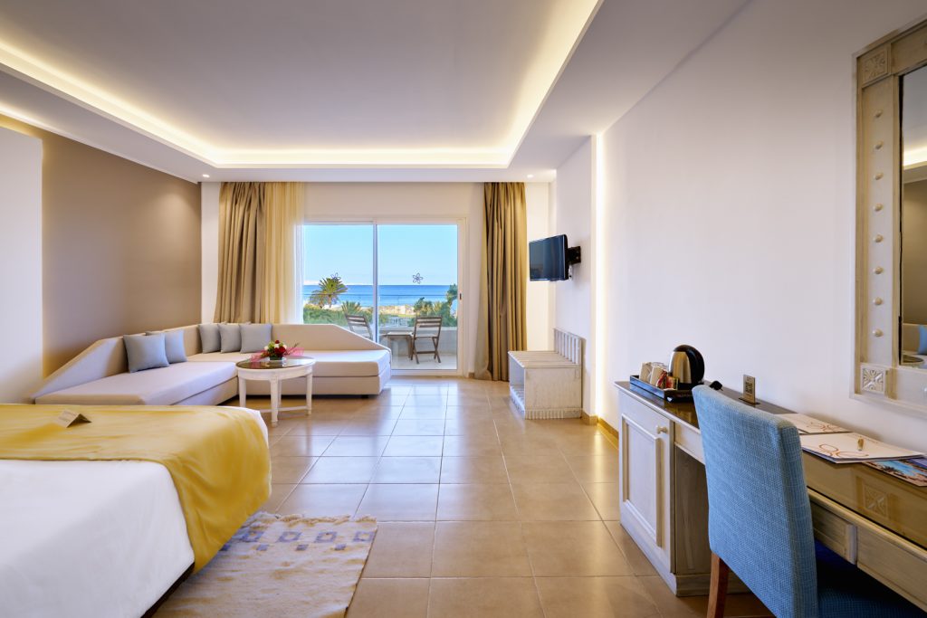 31-35 qm, 1x Schlafzimmer mit 1x Doppelbett oder 2x Einzelbetten und 1x Schlafsofa, saisonale Klimaanlage/Heizung (15.06-15. 09), Housekeeping Nachtschicht, im Hauptgebäude, Meerblick, Bettwäsche, Handtücher und Matratzen aus 100% Bio-Baumwolle, Handtuchwechsel (täglich), Badezimmer mit Dusche und WC, kostenloses Wi-Fi, Kaffee-/Teekocher, Vergrößerungsspiegel und Haartrockner, Zimmersafe, LCD-Fernseher mit internationalen Kanälen, Minikühlschrank (Auffüllung 1x p.P am Anreisetag), Zimmerservice gegen Aufpreis und Weckservice, Balkon oder Terrasse.(Rauchen und Dampfen verboten)