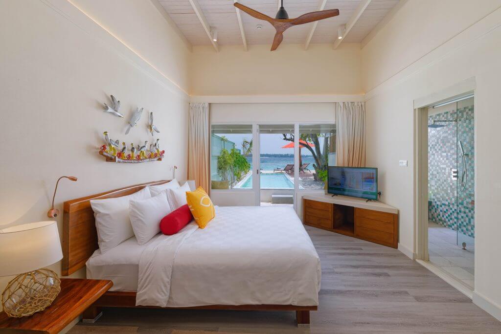 61-70 qm, Villa, Deluxe, in einer Doppelhaushälfte, Strandlage, Meerblick, nach oben halb offenes Bad, Dusche, WC, Bademantel, Haartrockner, Klimaanlage, Ventilator, Minibar Auffüllung täglich (Softdrinks, Wasser, Bier), Safe, TV, WLAN, Wasserkocher, Espressomachine, Terrasse (möbliert), direkter Strandzugang, Privatpool