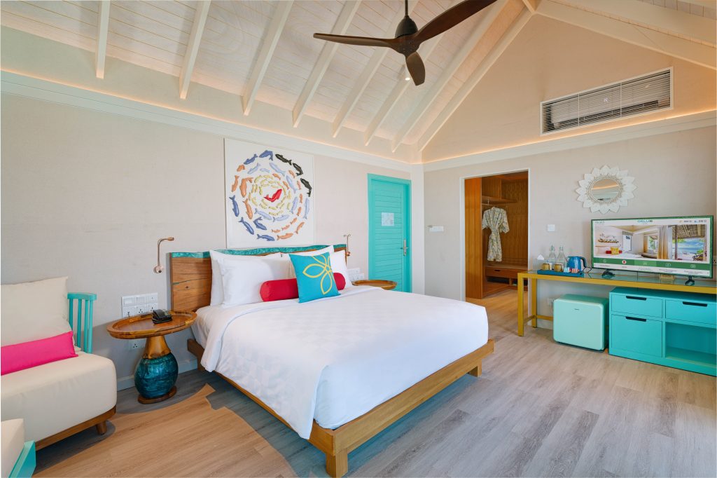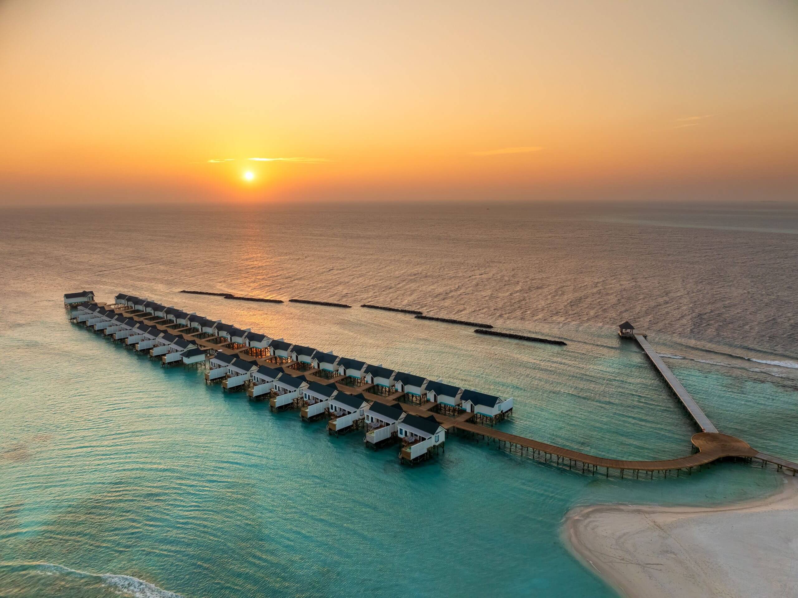 81-90 qm, Villa, Sonnenaufgangsseite, Wasserbungalow (auf Stelzen über der Lagune), Meerblick, Lagunenblick, Dusche, WC, Bademantel, Haartrockner, Klimaanlage, Ventilator, Minibar Auffüllung täglich (Softdrinks, Wasser, Bier), Safe, TV, WLAN, Wasserkocher, Espressomachine, Terrasse (möbliert), direkter Meerzugang, Privatpool