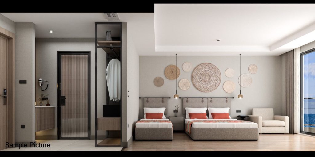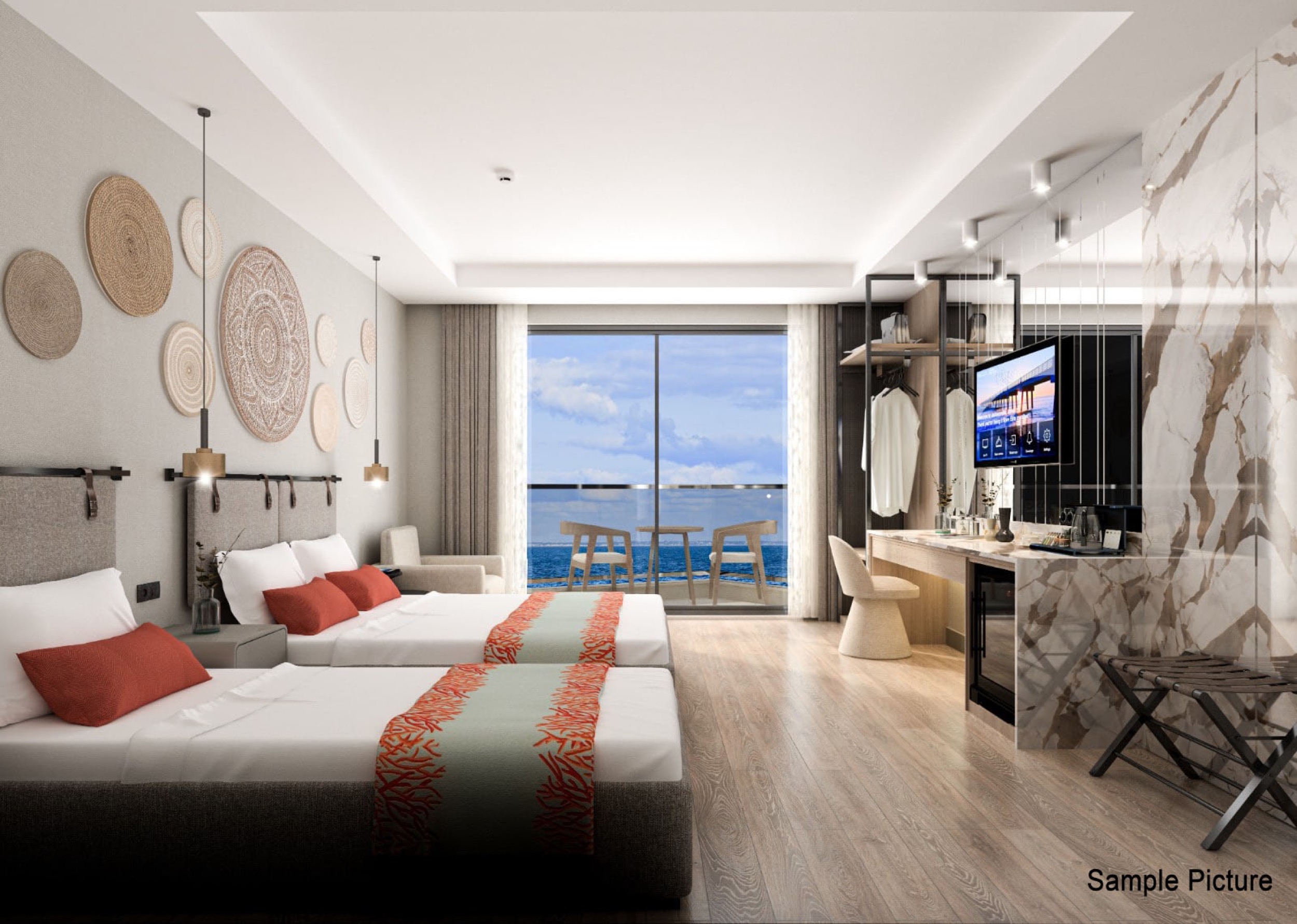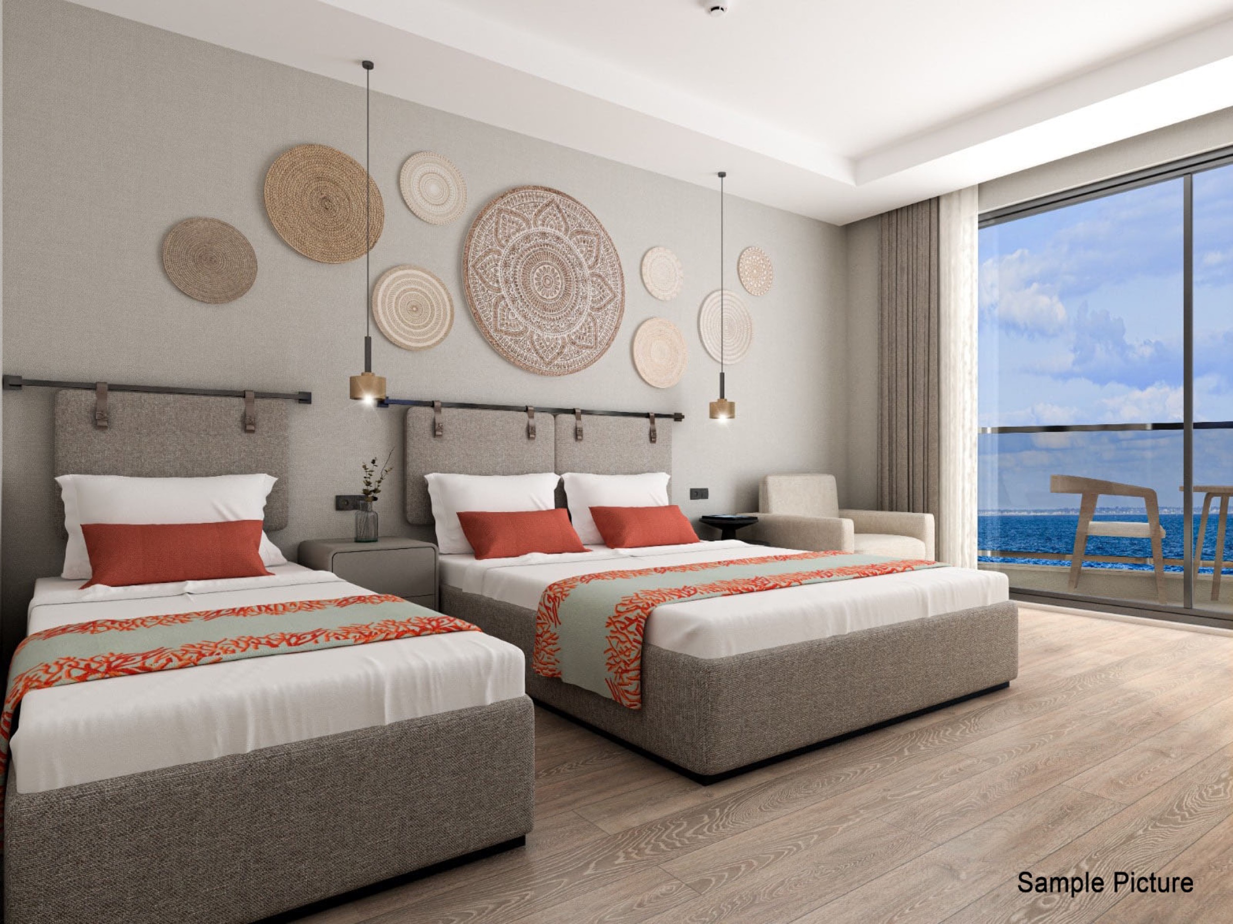 31-35 qm, Doppel, Meerblick, Poolblick, 3 Einzelbetten, Dusche, WC, Badeslipper, Haartrockner, Laminatboden, Klimaanlage, zentral gesteuert, Minibar, Auffüllung täglich, Softdrinks, Mineralwasser, Bier, Wasser, Safe, TV (Sat-TV), Wasserkocher, Kaffee/Tee, Balkon, direkter Poolzugang, Gemeinschaftspool, Kopfkissen-Menü
